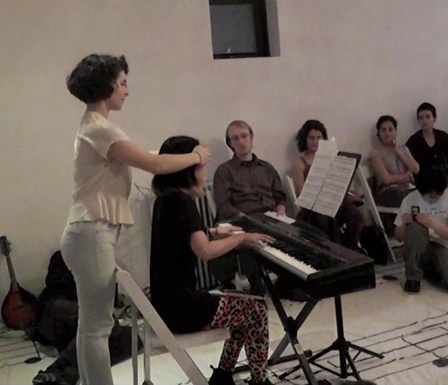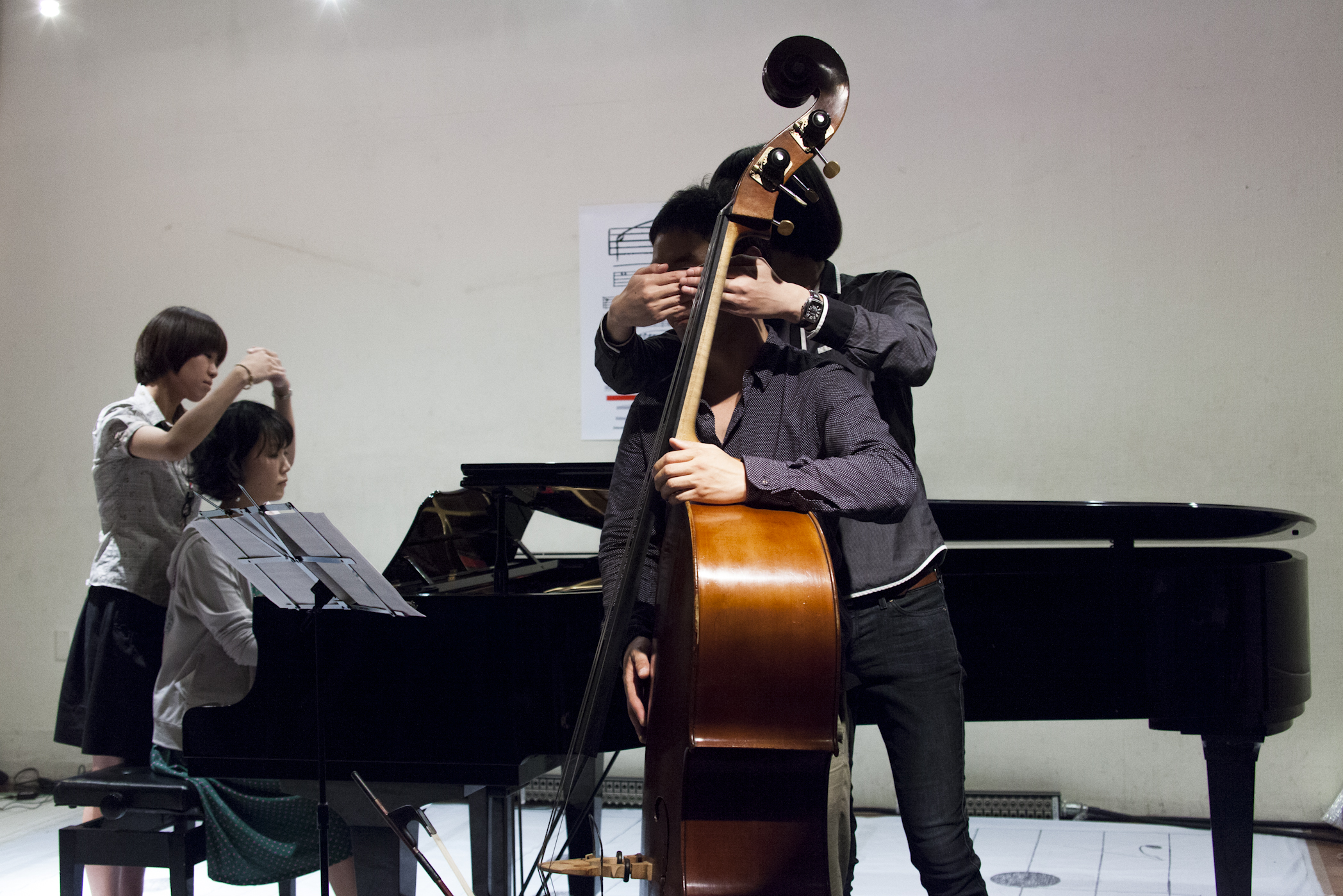 For any number of duos. If more than one pair, a score which is written for the given number of instrumentalists should be found (or composed). The instrumentalist plays, reading from the score. His/her partner stands behind him/her. At any given moment, the partner can cover the eyes of the instrumentalist with his/her hands. Whenever this occurs, the instrumentalist should try as much as s/he can to continue playing as if nothing has happened.
