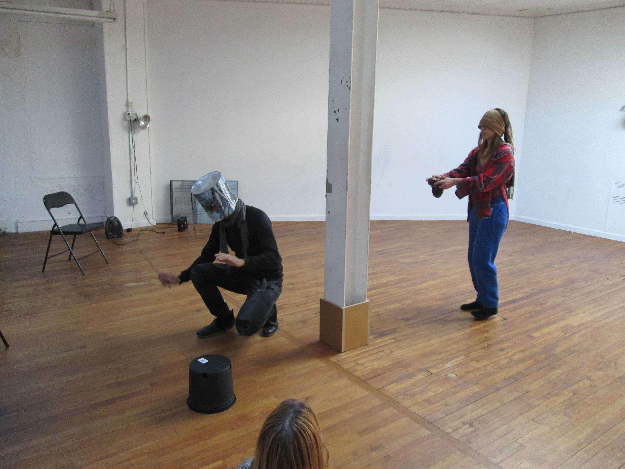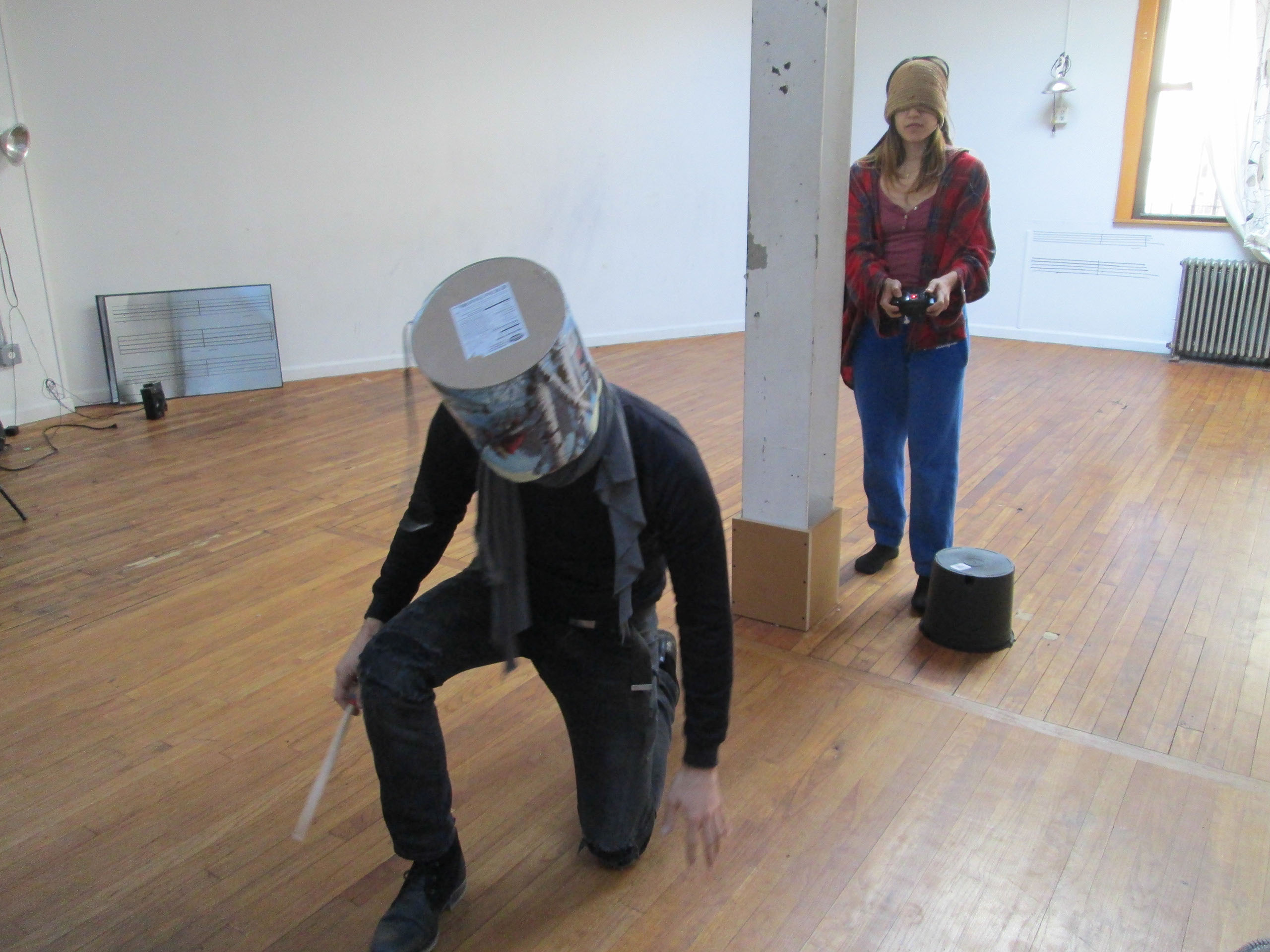 Place a Radio-Controlled car inside a container turned upside-down. The container could be of any material, but should be big enough to enclose the RC car. Both performers are blindfolded. One tries to hit the container while the other manipulates the car, and gives instructions on how to reach the car. Other obstacles may be placed around the stage. It is also possible to use two cars and have each operated by one performer simultaneously.