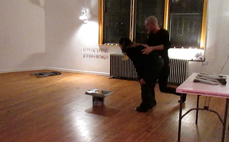 One performer sings a “found” or composed score. The other performer plays a different “found” or composed score on the body of the first performer.