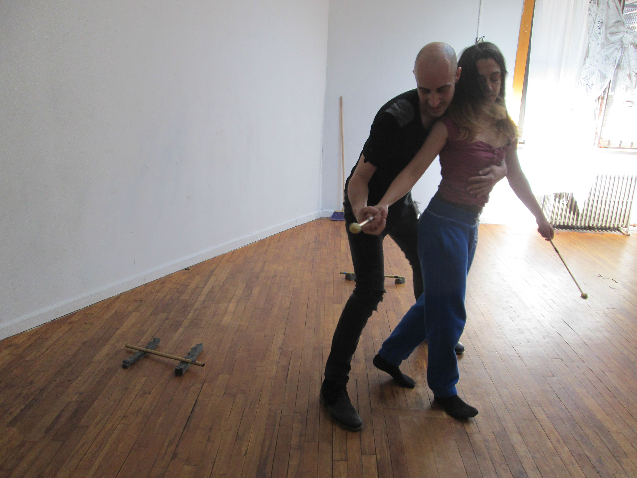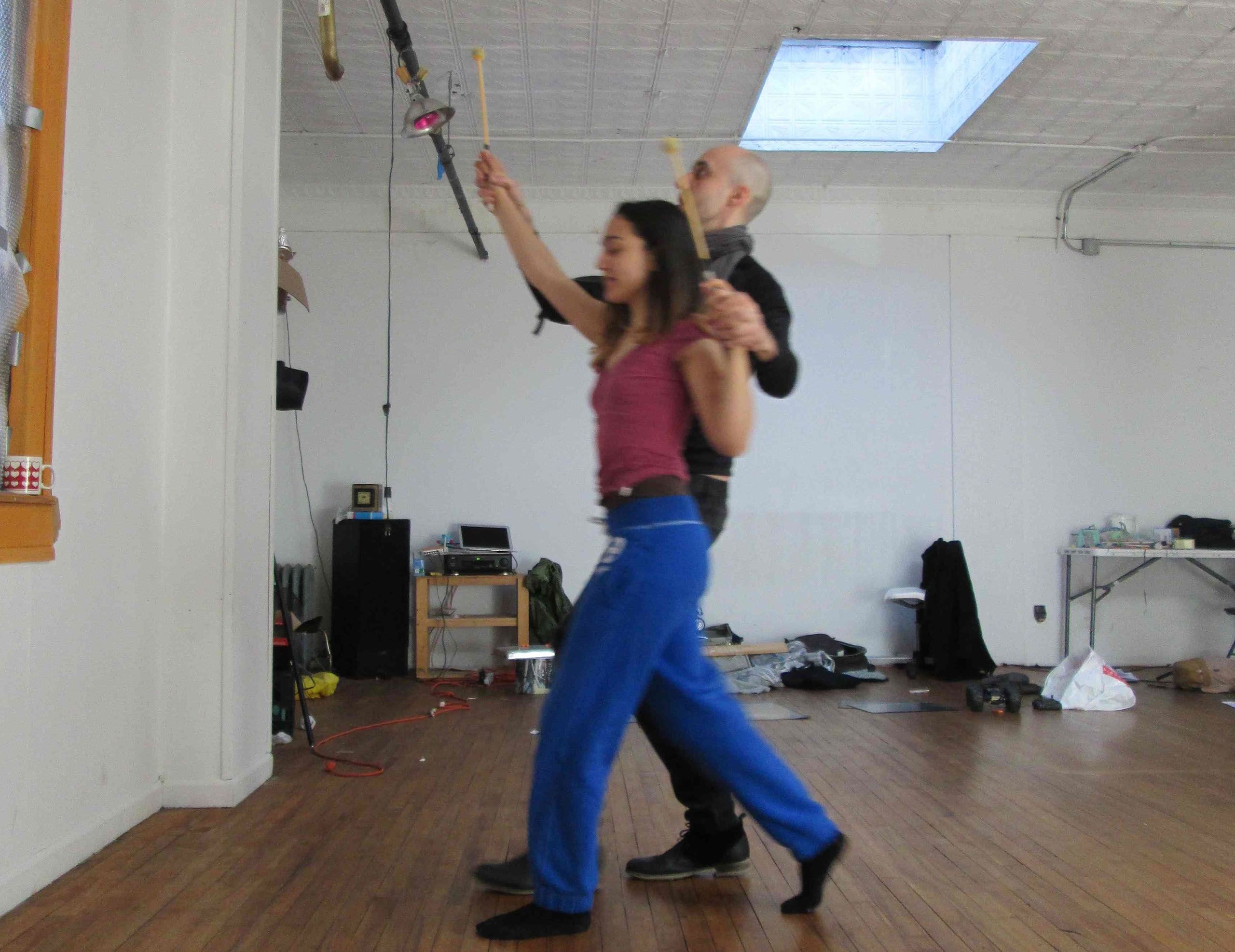 A duet for any kind of instrument. One performer tries to play a “found” or a composed score on any given instrument. S/he may not touch the instrument, but must use the body of the other performer to play the piece.