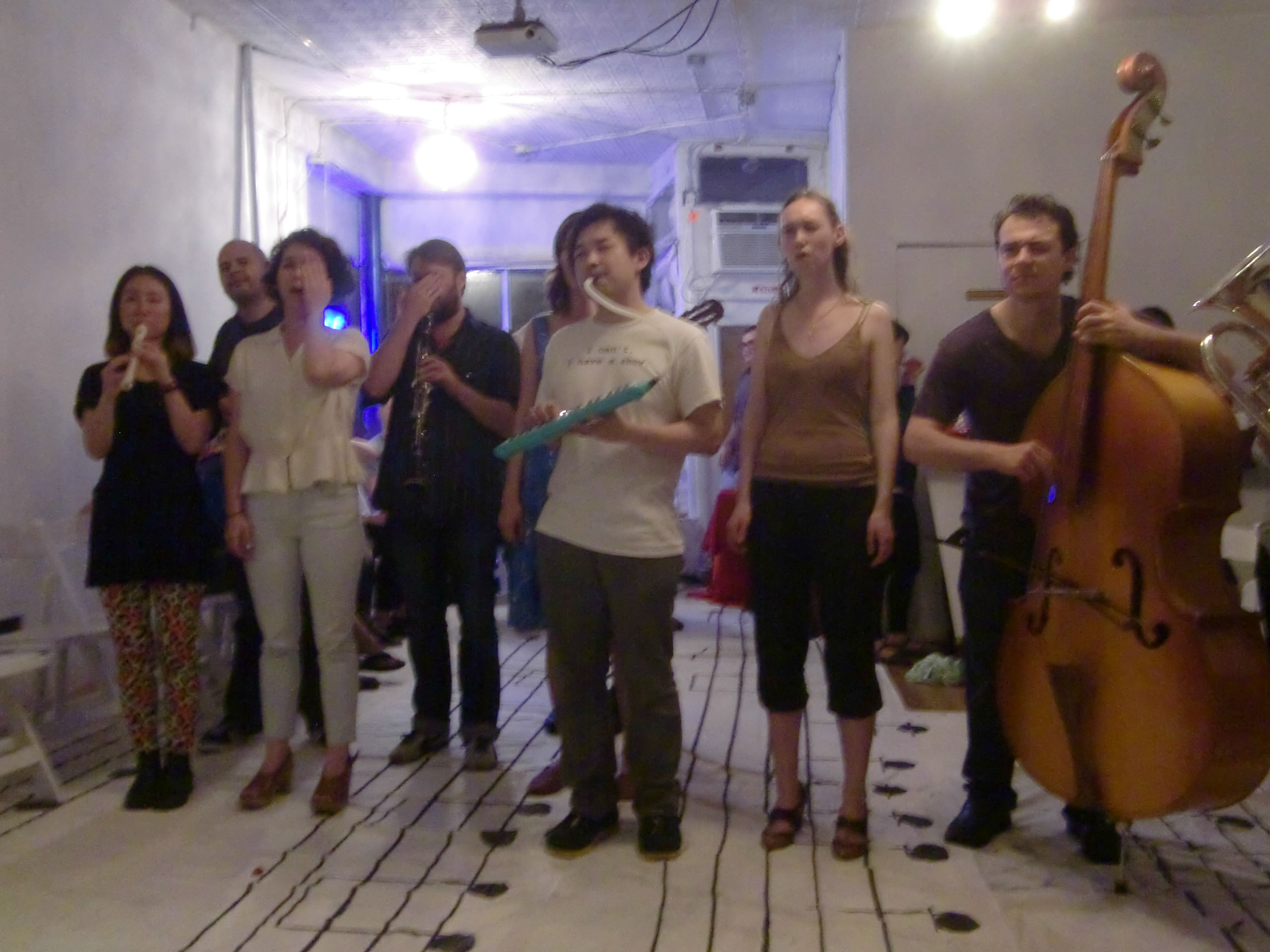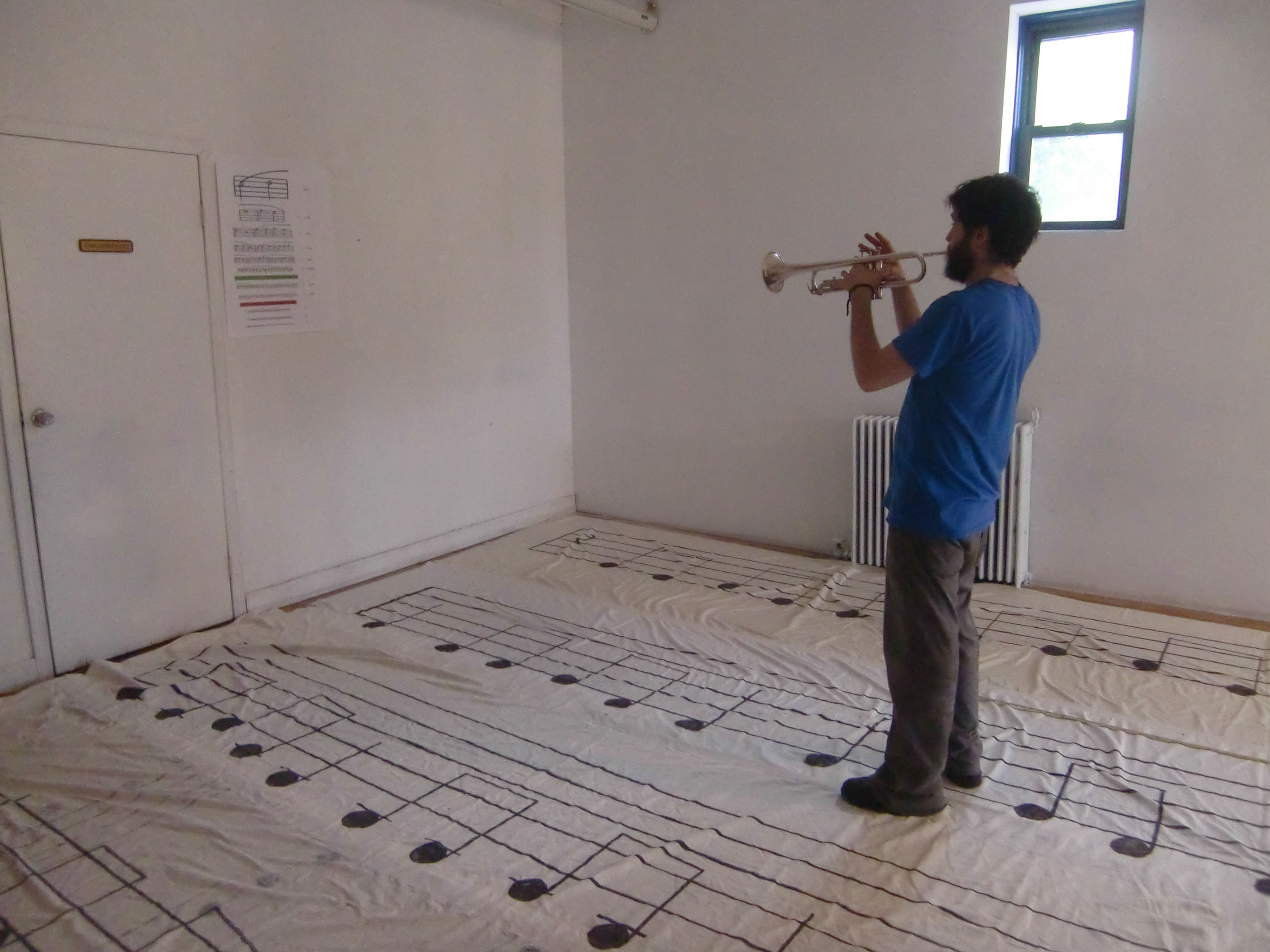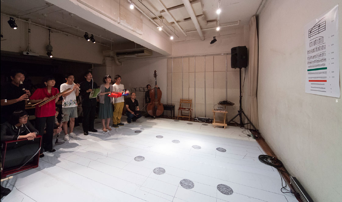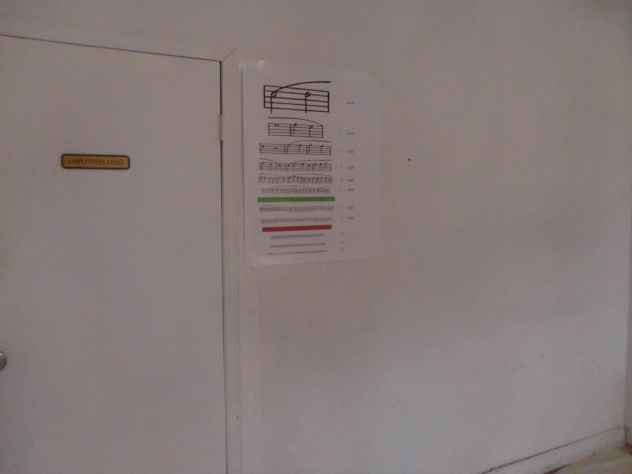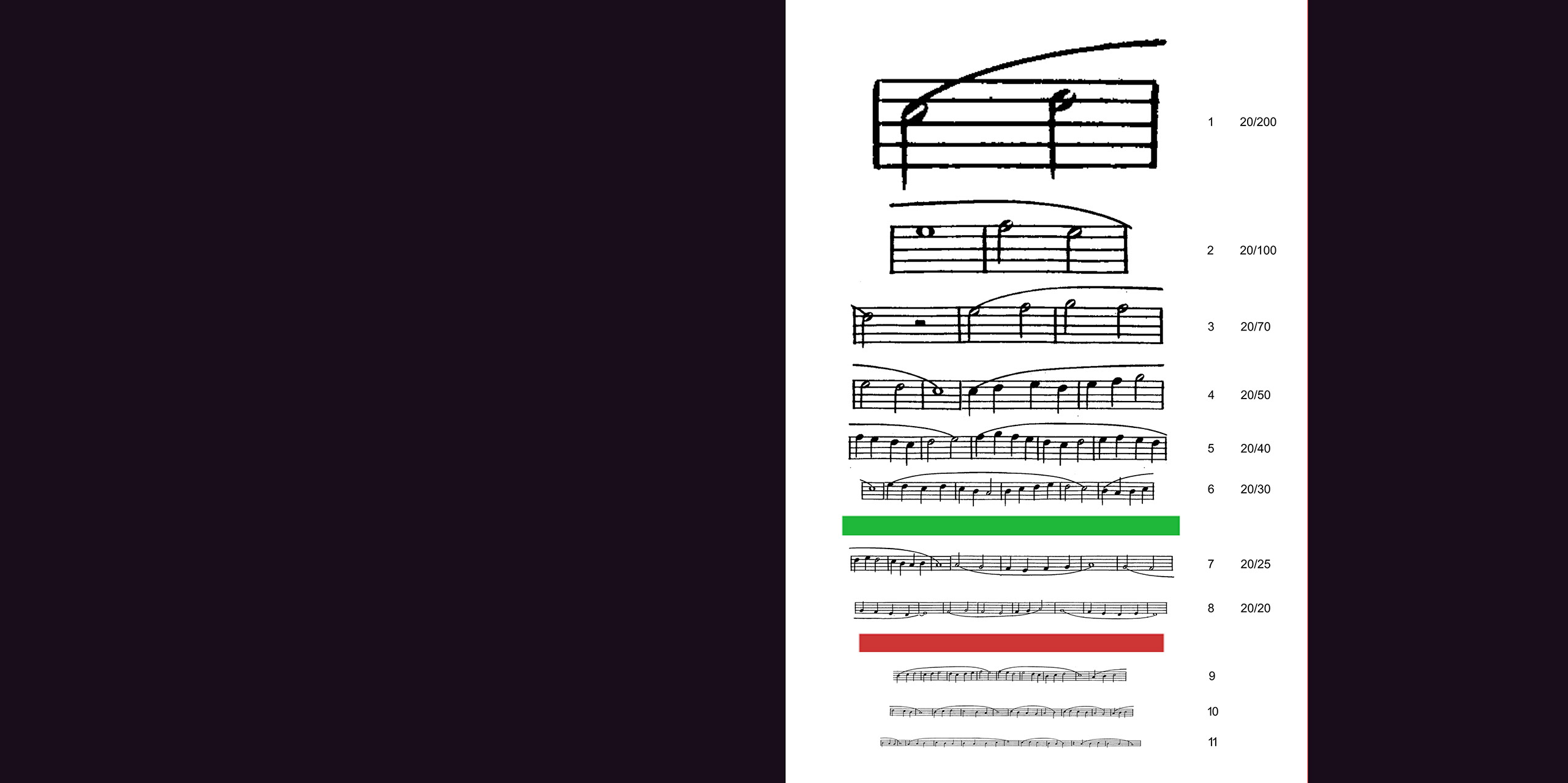 For any number of performers, but not less than four. Write a score, or transcribe a “found score” in the form of an eye-chart, so that the size of notes gradually decrease as they proceed. Use the Snellen chart as model, and arrange the notes in eleven vertical rows. The exact number of notes in each row may not follow the Snellen chart, but should increase as their size decreases. The size of notes should follow the Snellen chart but with the following modifications: the standard optotype size should be vertically divided to accommodate three notes (four staves). The fifth staff should be added keeping the same interval. So a note on the topmost row (20/200) should be sized 29.6mm (88.7 mm/3) tall, the eight row (20/20) should be sized 2.96 mm tall, and so on. The intervals between the rows should be arranged to accommodate the note stems and the use of ledger lines. When written instruction is used, the letter size should follow the Snellen chart. The green and red blocks usually inserted respectively after the sixth and eighth rows in the Snellen chart, may or may not be used. At the performance, all the performers stand twenty feet away from the score and perform in unison. Each performer drops out when s/he can read no more. The piece ends when the last performer drops out.
