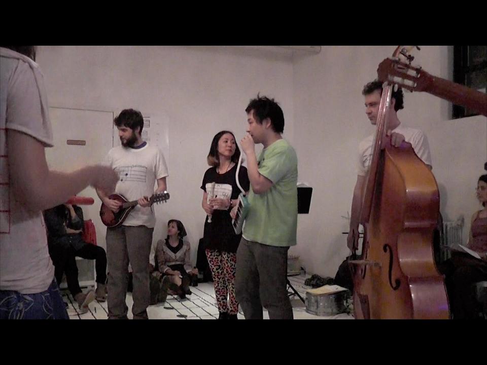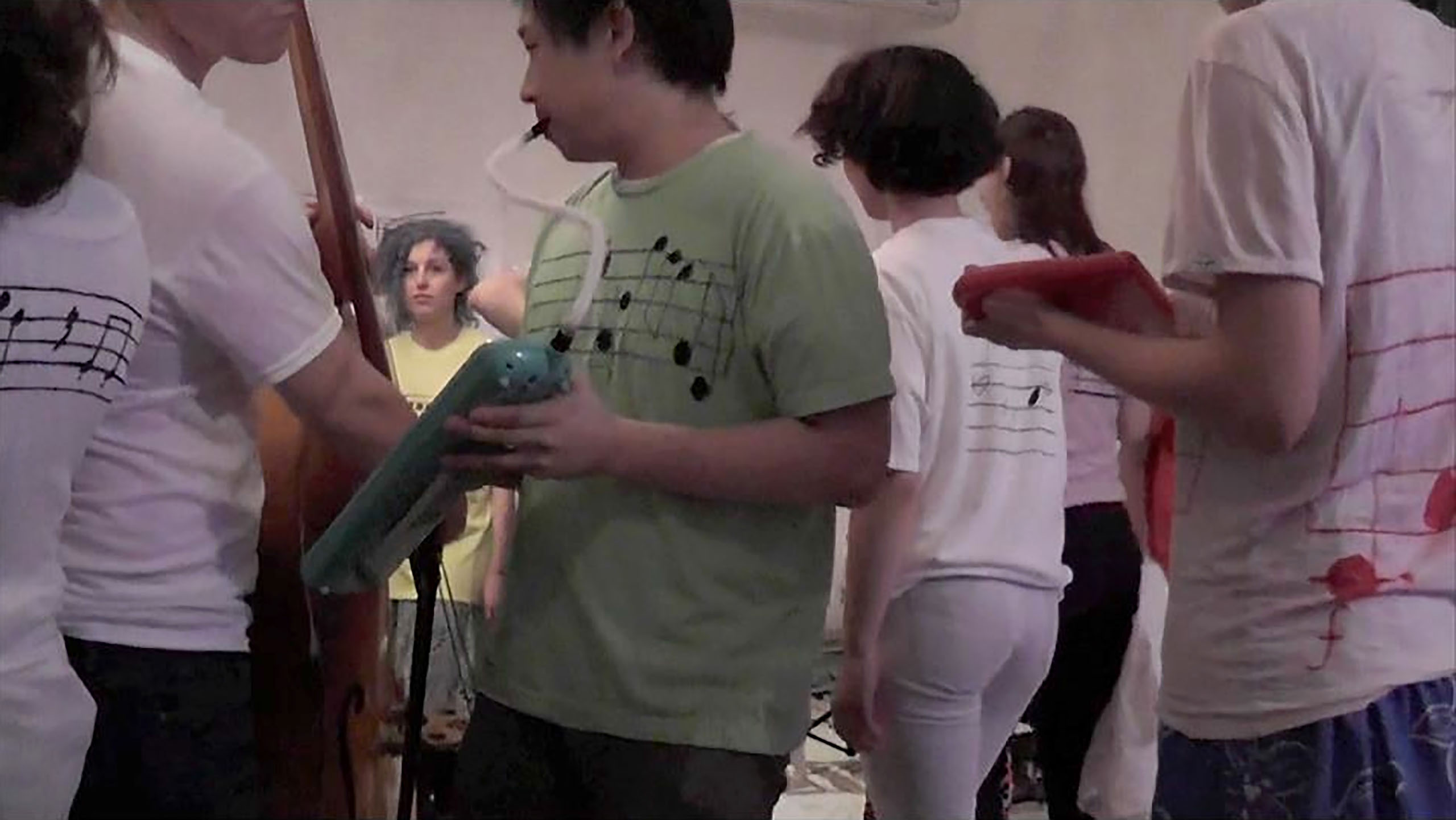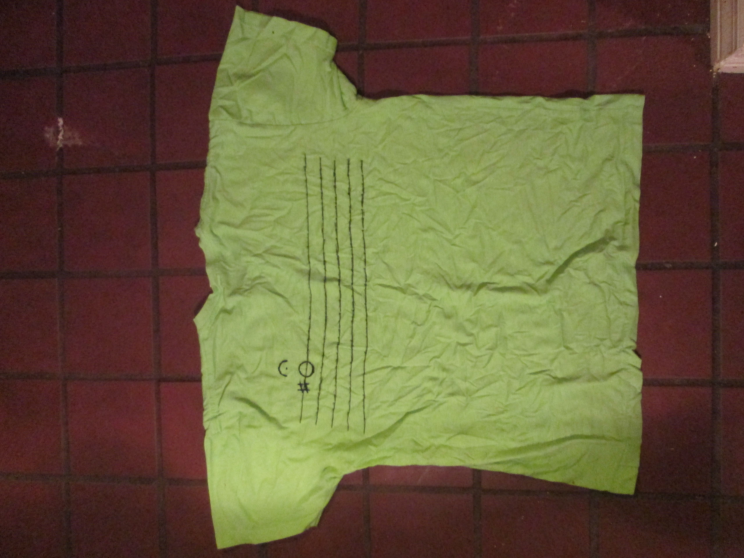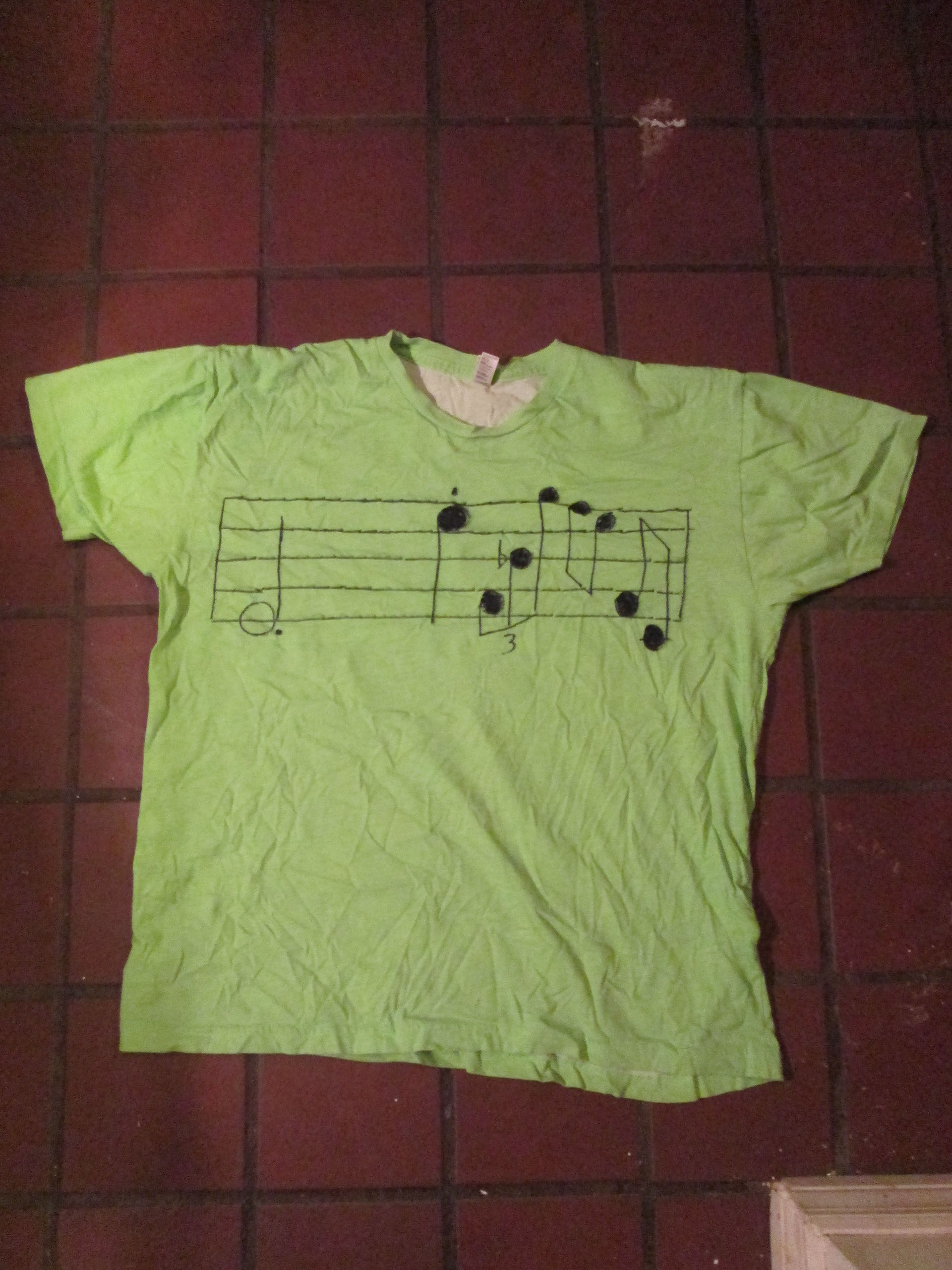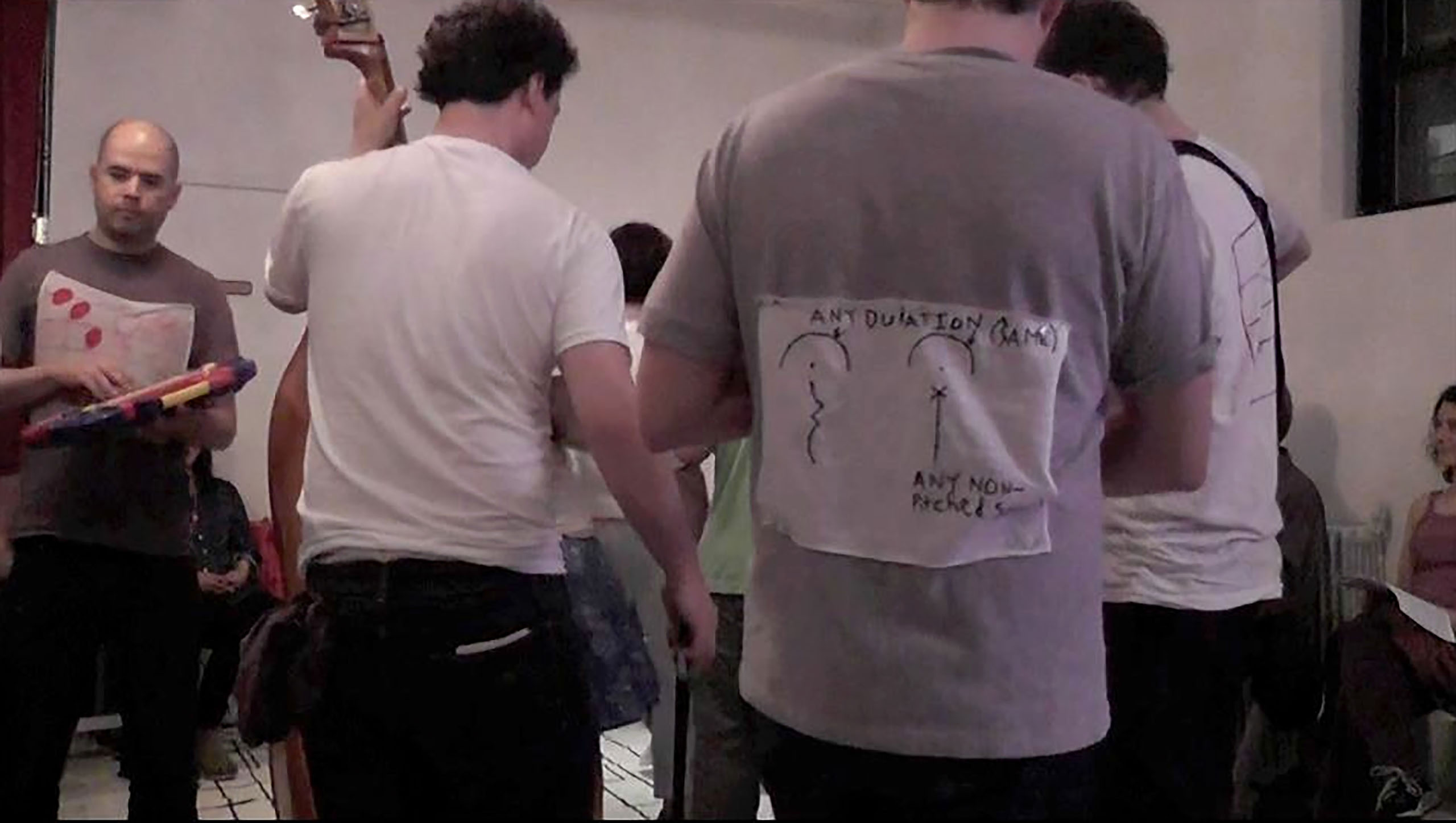 Version A: Gather as many performers as possible All performers wear a T-shirt with fragments of scores printed or written on it. The score can be newly composed, or can be a transcription of a found score. No clef signs should be used to allow maximum flexibility for available instruments. Prepare two special T-shirts with barlines for the beginning and ending of the piece. Each performer starts playing after s/he sees the T-shirt with the beginning barline. During the performance, the performers must constantly move around and play whatever fragment of score (on the T-shirts of other performers) that they see. They each stop playing when they see the T-shirt with the final barline. The performer with the final barline T-shirt may choose to hide from other performers for as long as s/he wants.