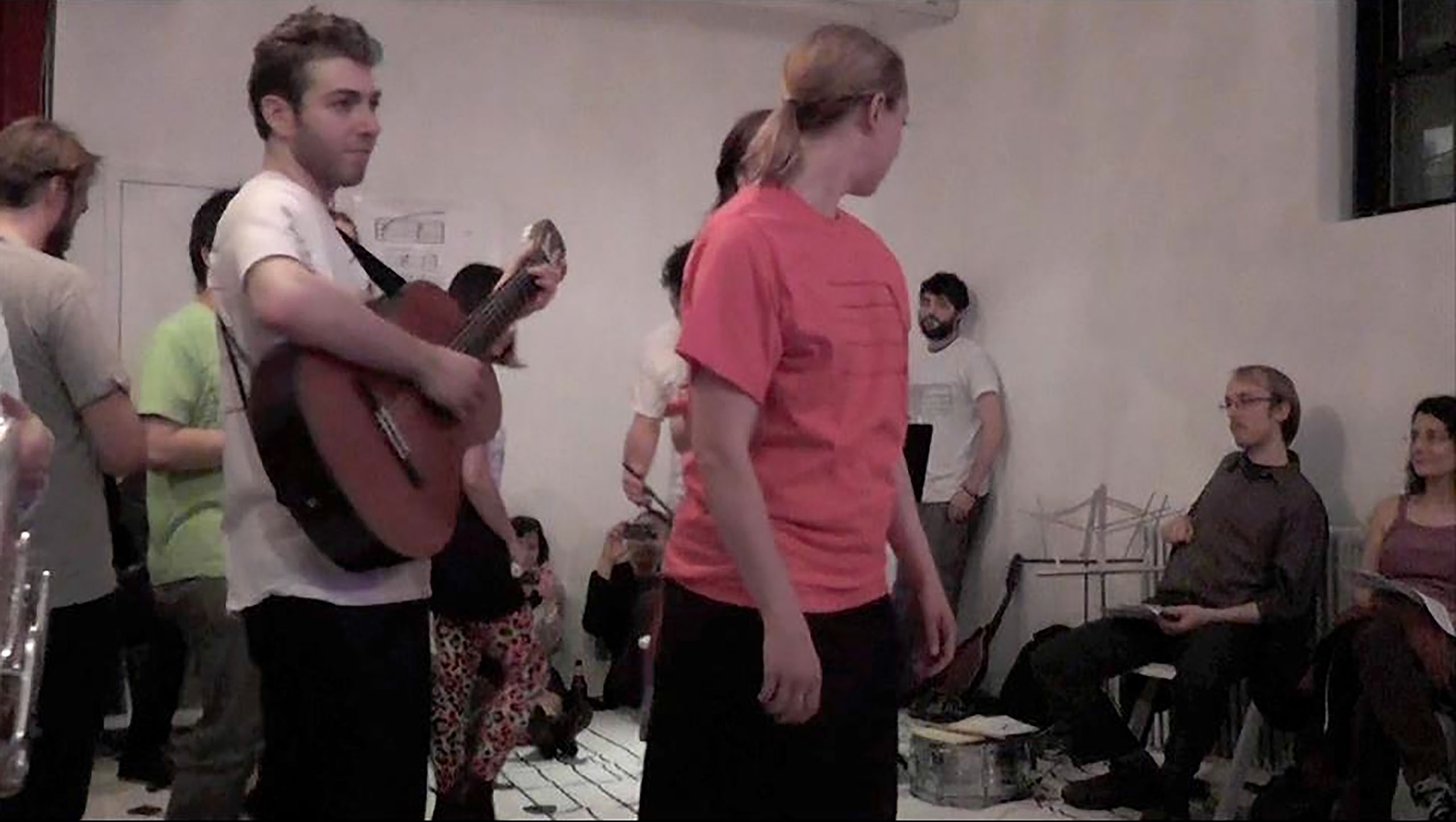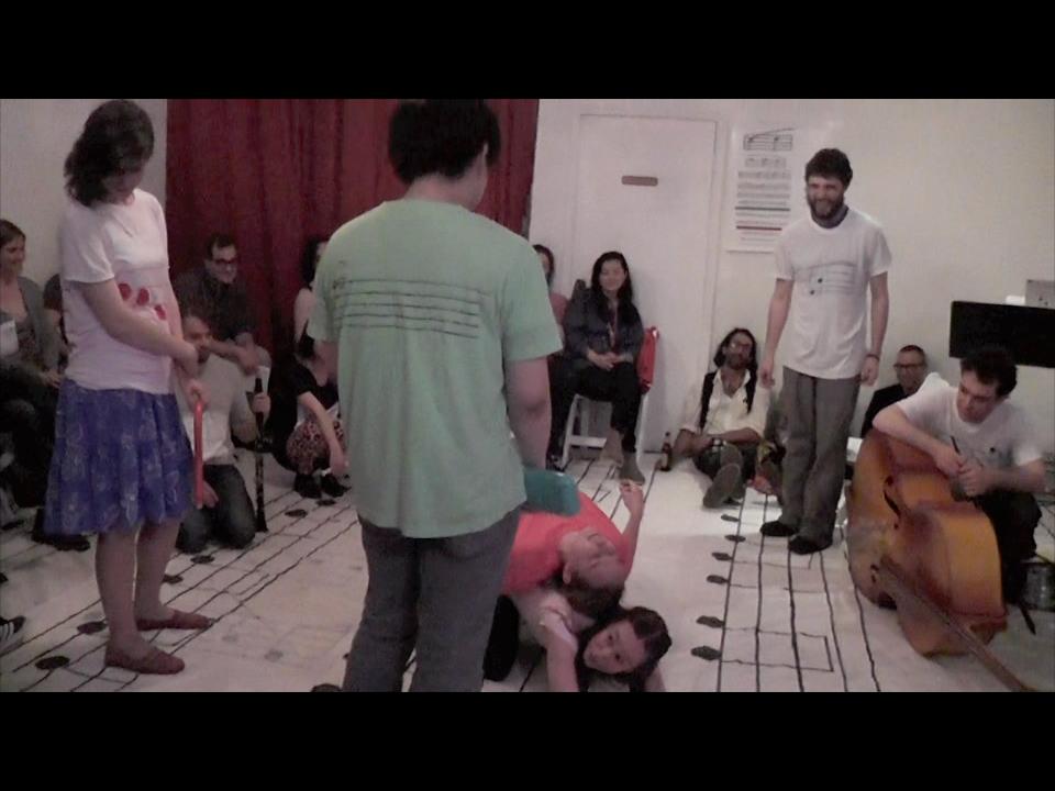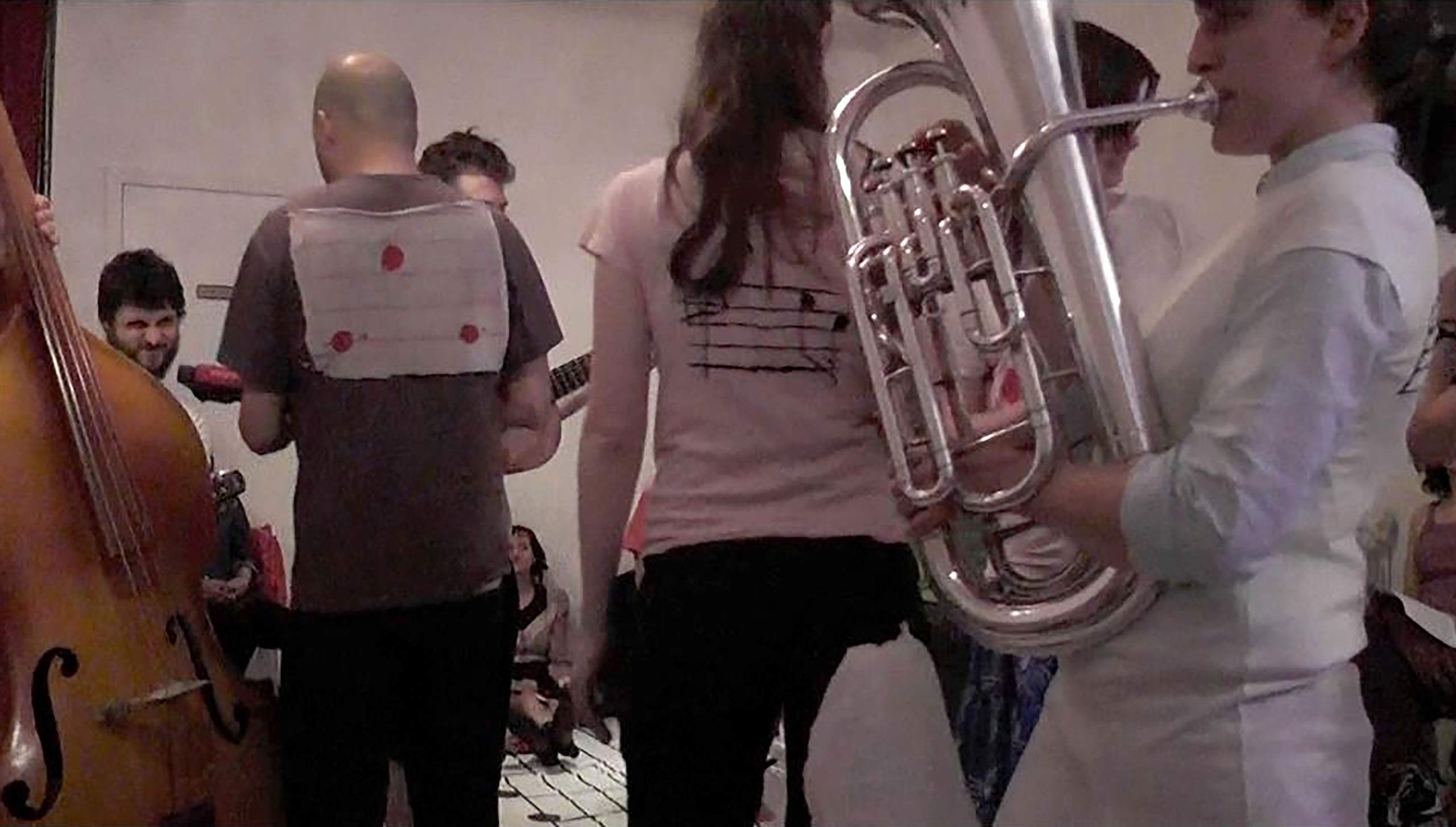 Version C: For dancers and musicians. The dancers wear the T-shirts, and the musicians sit around the dancers and perform the visible score on the dancers. Dancers dance to the music.