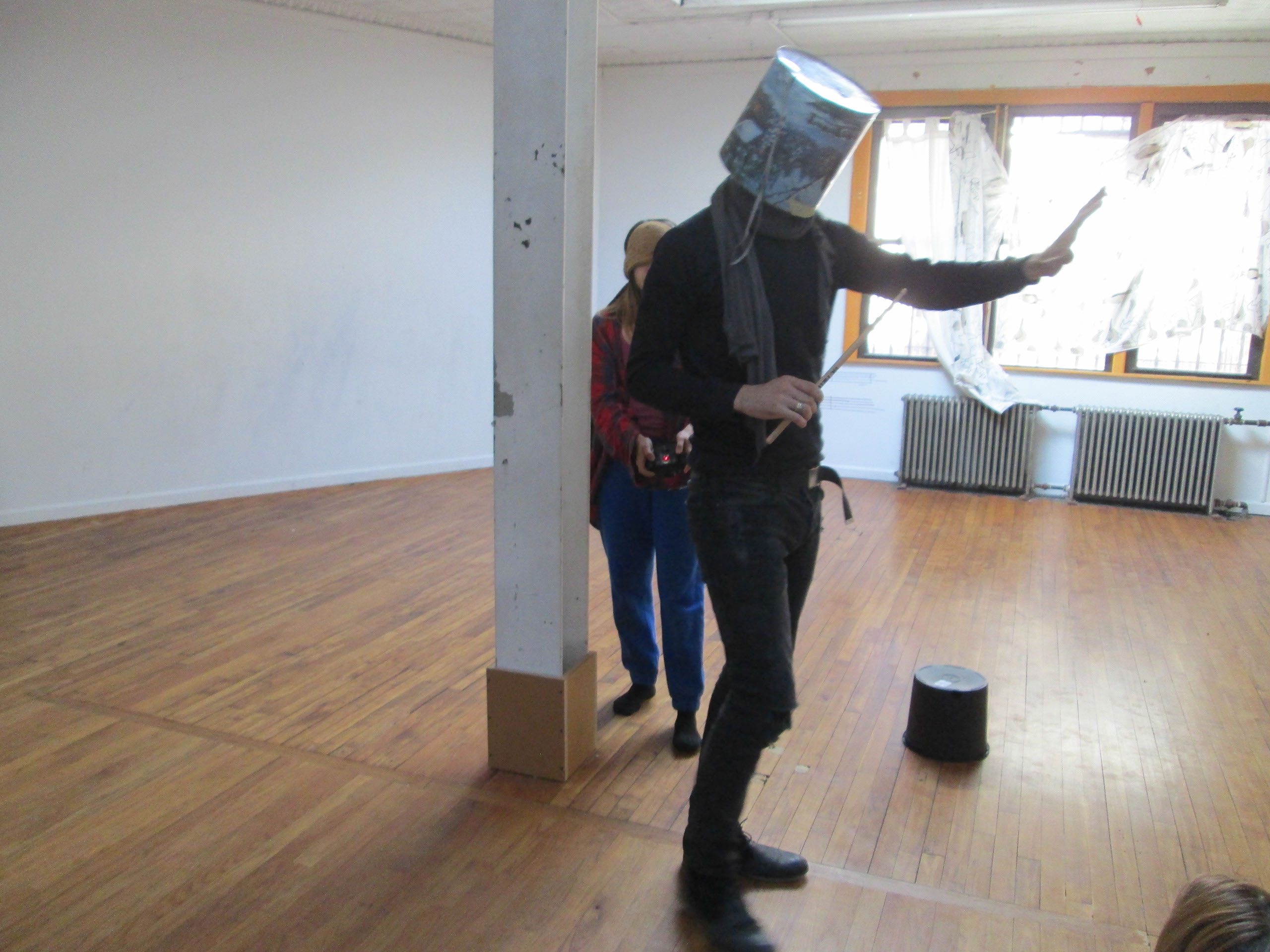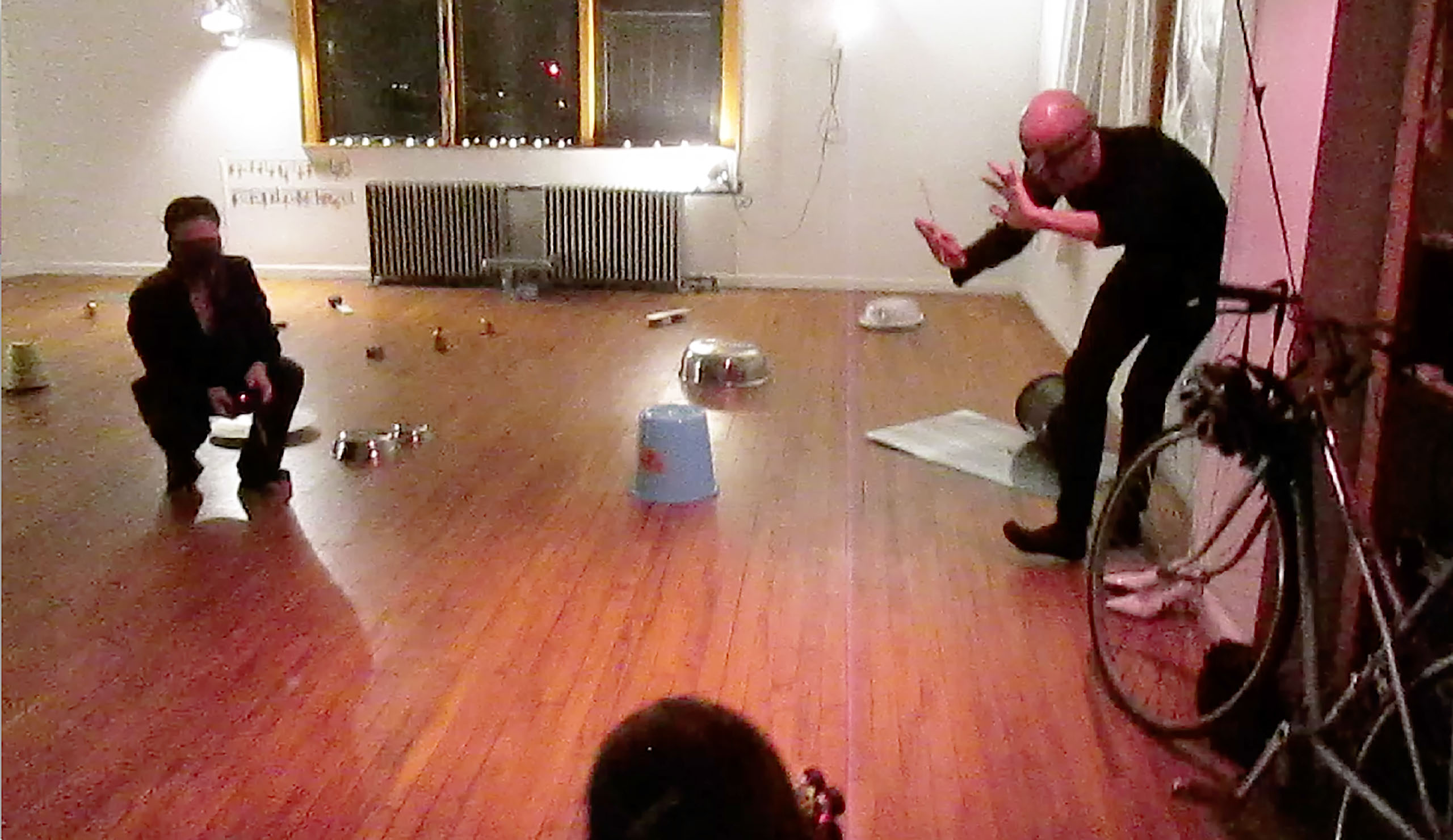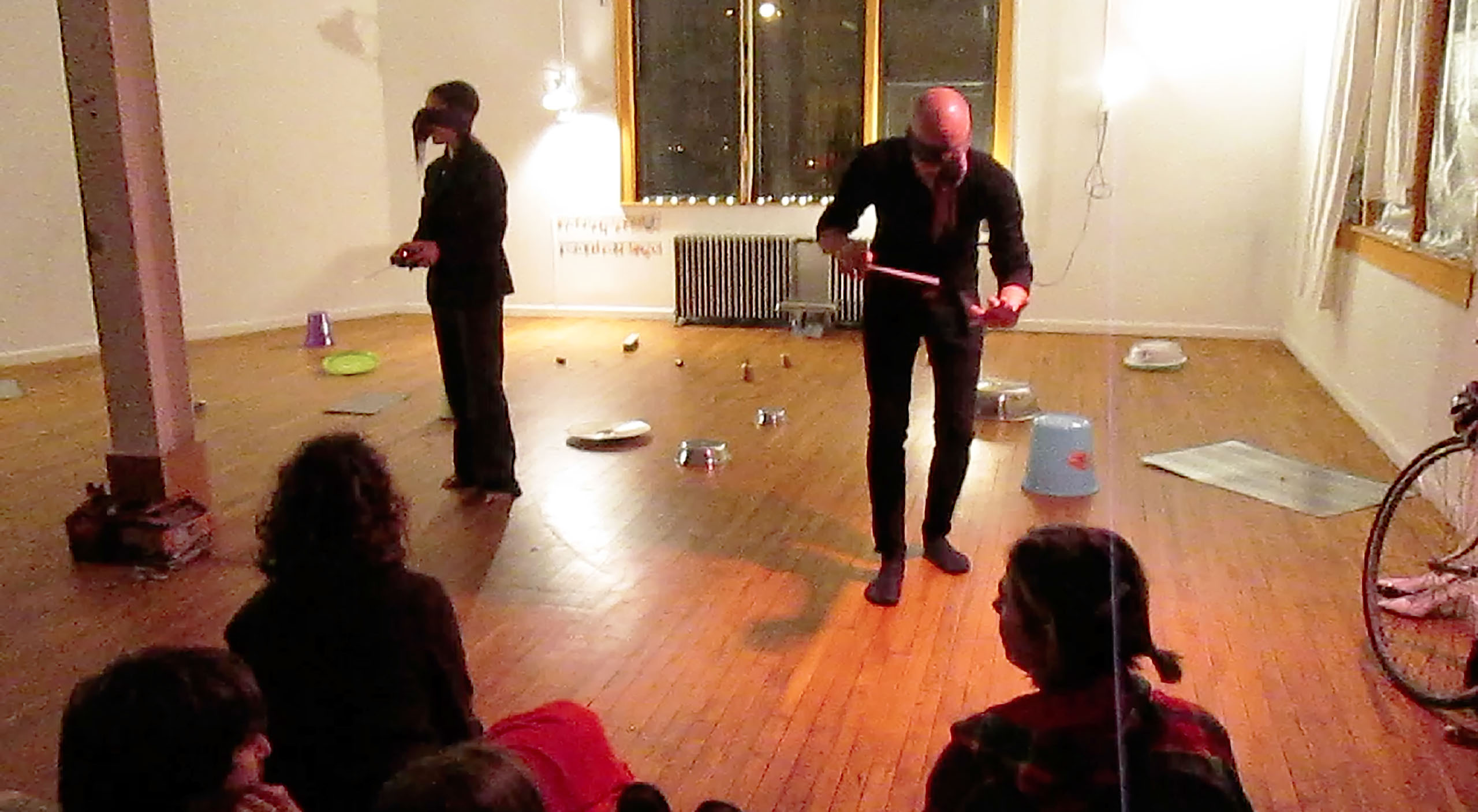 Place a Radio-Controlled car inside a container turned upside-down. The container could be of any material, but should be big enough to enclose the RC car. Both performers are blindfolded. One tries to hit the container while the other manipulates the car, and gives instructions on how to reach the car. Other obstacles may be placed around the stage. It is also possible to use two cars and have each operated by one performer simultaneously.