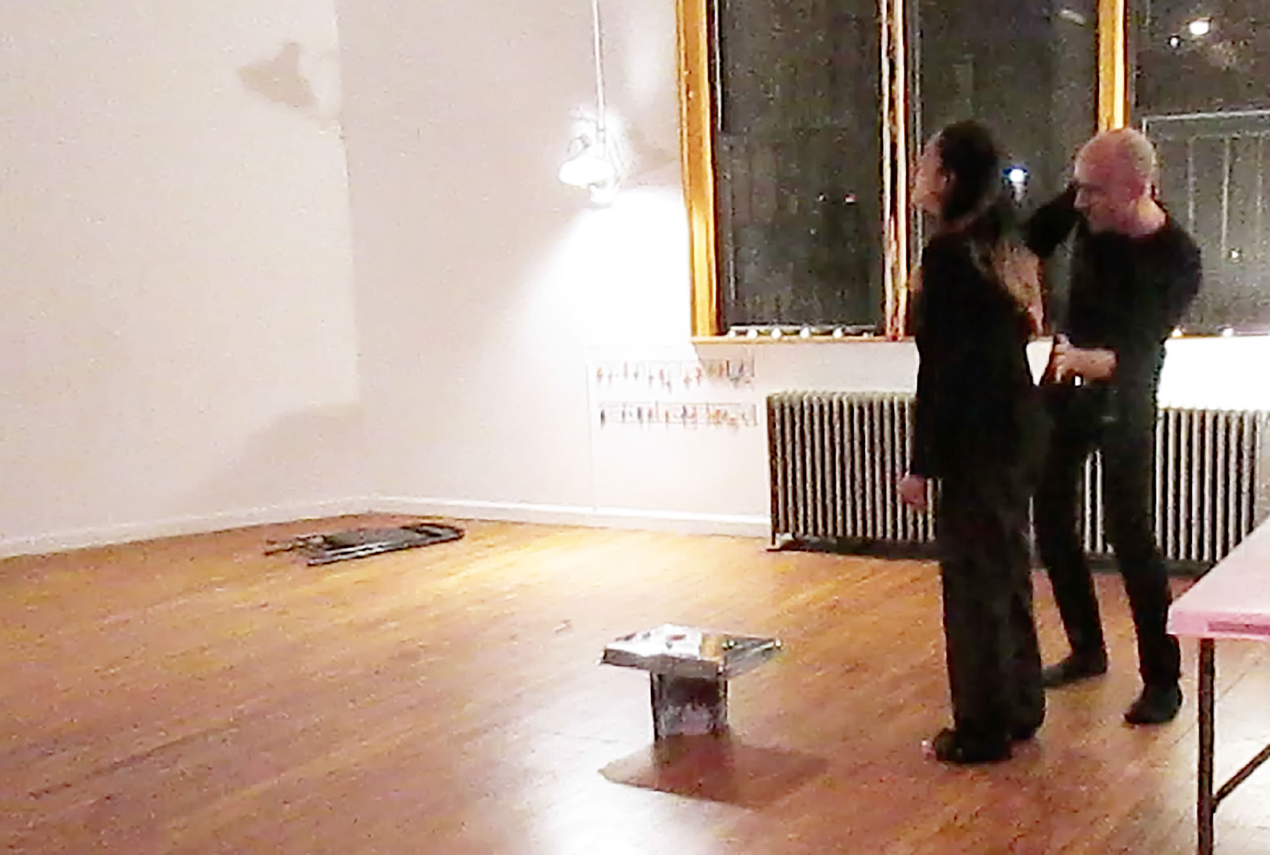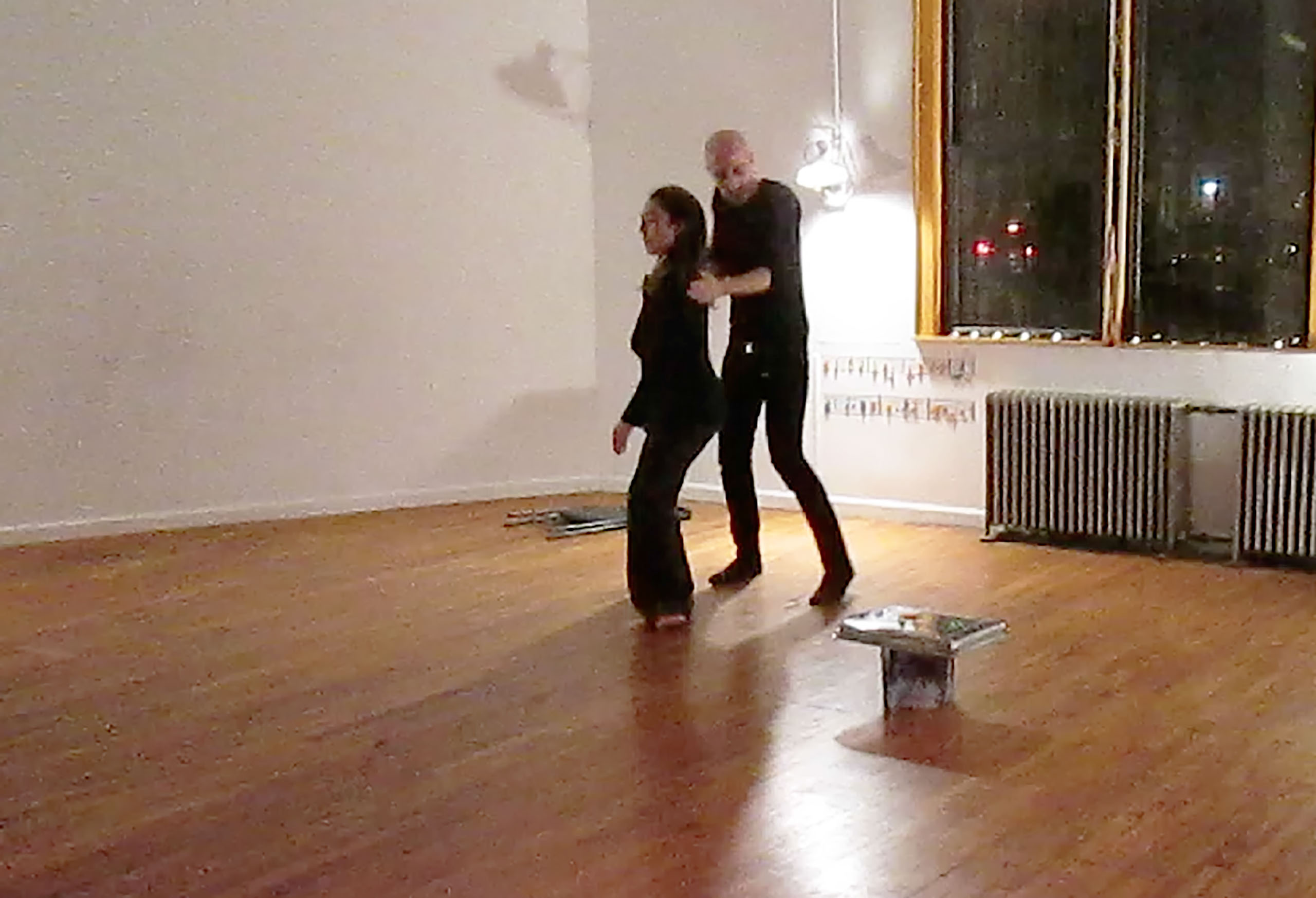 One performer sings a “found” or composed score. The other performer plays a different “found” or composed score on the body of the first performer.