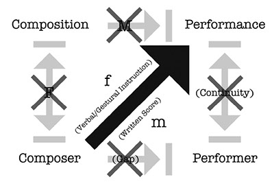 Improvised Composition F has been primarily been performed as dance, and Improvised Composition M primarily as music, but genre designations are not essential--the difference is between two modes of conveying what is composed: verbal/gestural instructions (a feminine mode) and written scores (a masculine mode). In fact, the first can also be arranged to be performed as music, and the second as dance (or any other genre where issues of performance and composition is relevant, such as theatre). But yes, the dichotomy persists.
